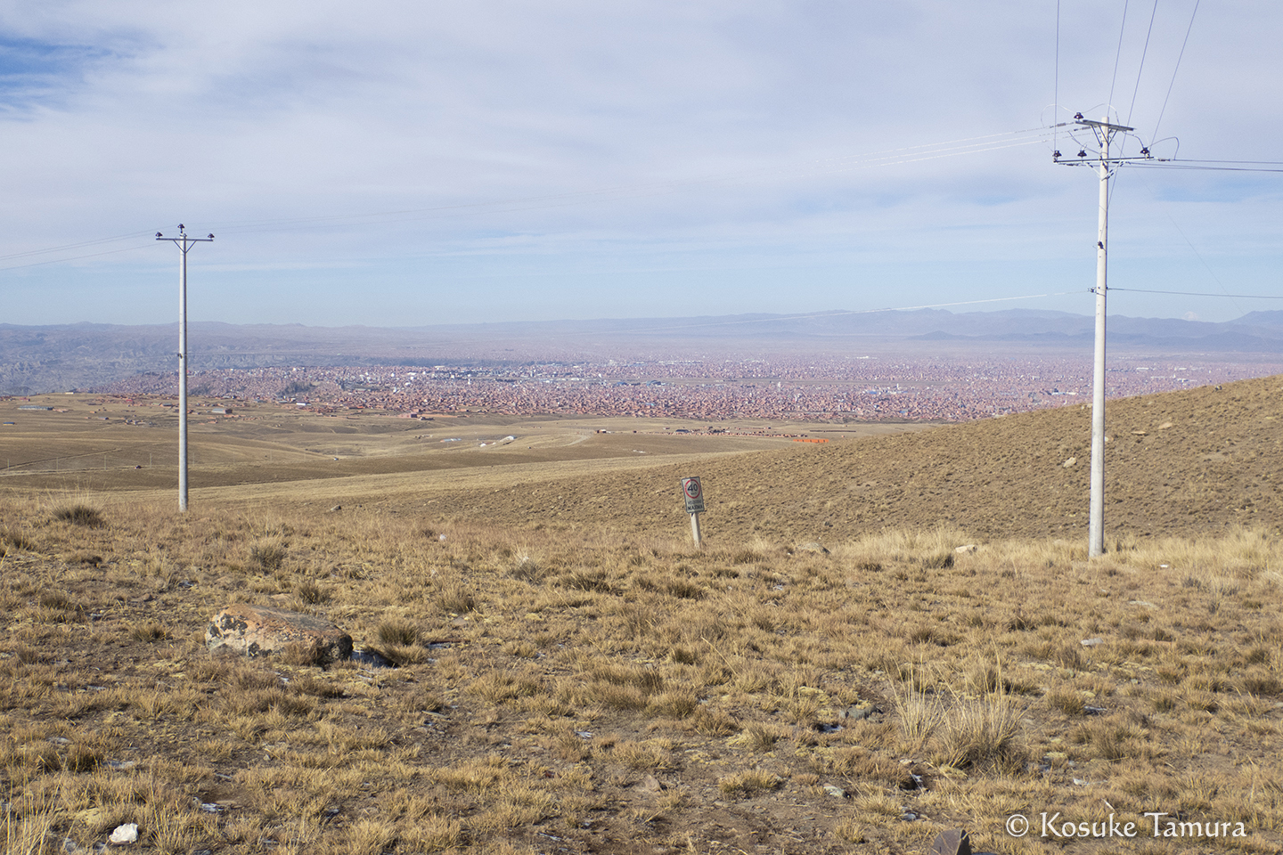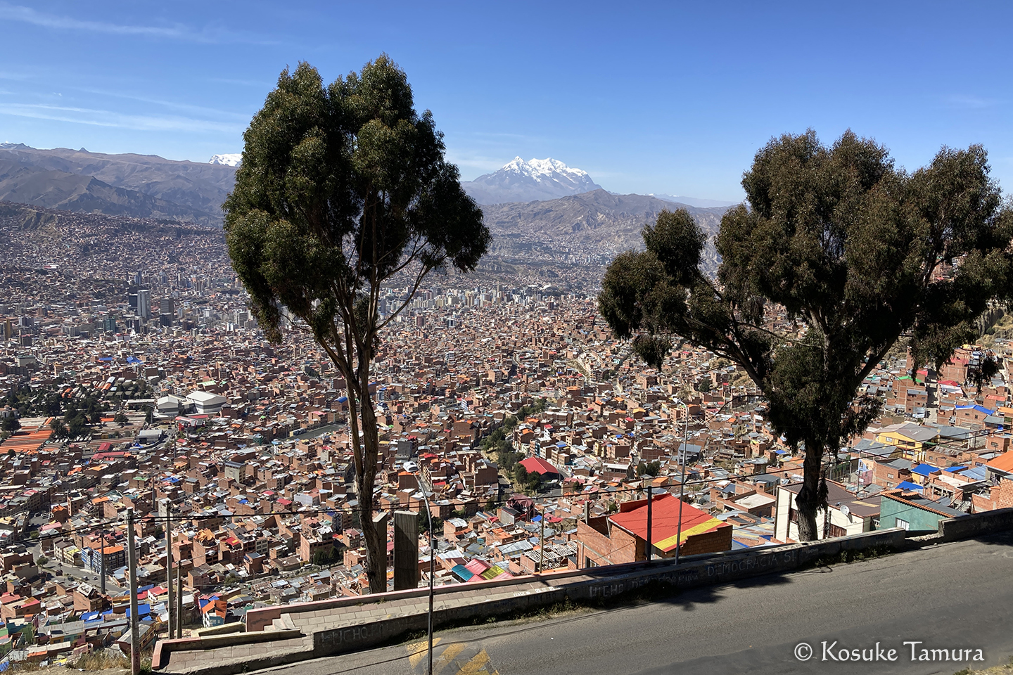 空港を出ると待ち受けていたのは、ラパスの独特な景観だった。ボウル状の地形一面に市街地が広がり、無数のケーブルカーが往来し、奥にはラパスの街を見守るイリマニが鎮座している。