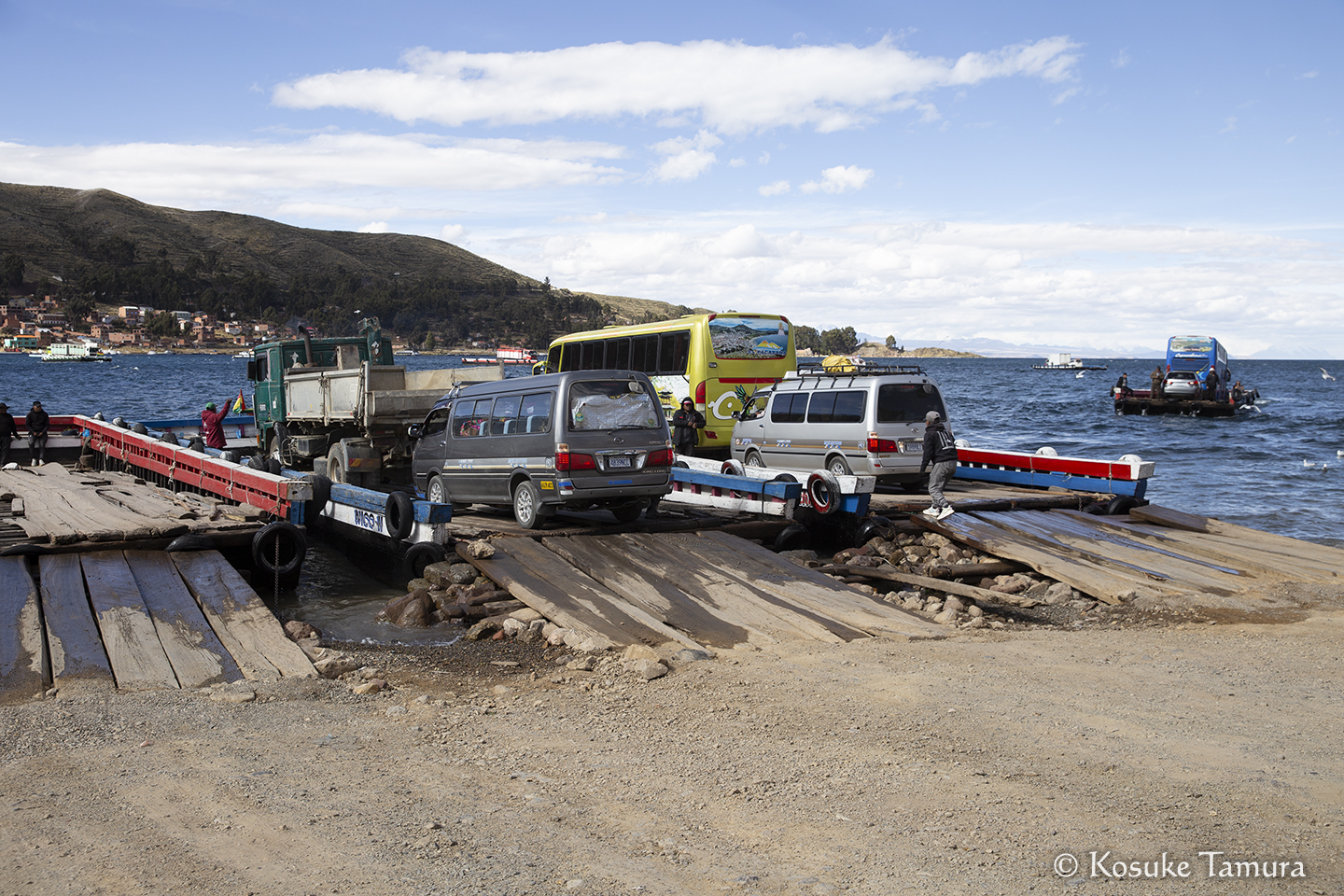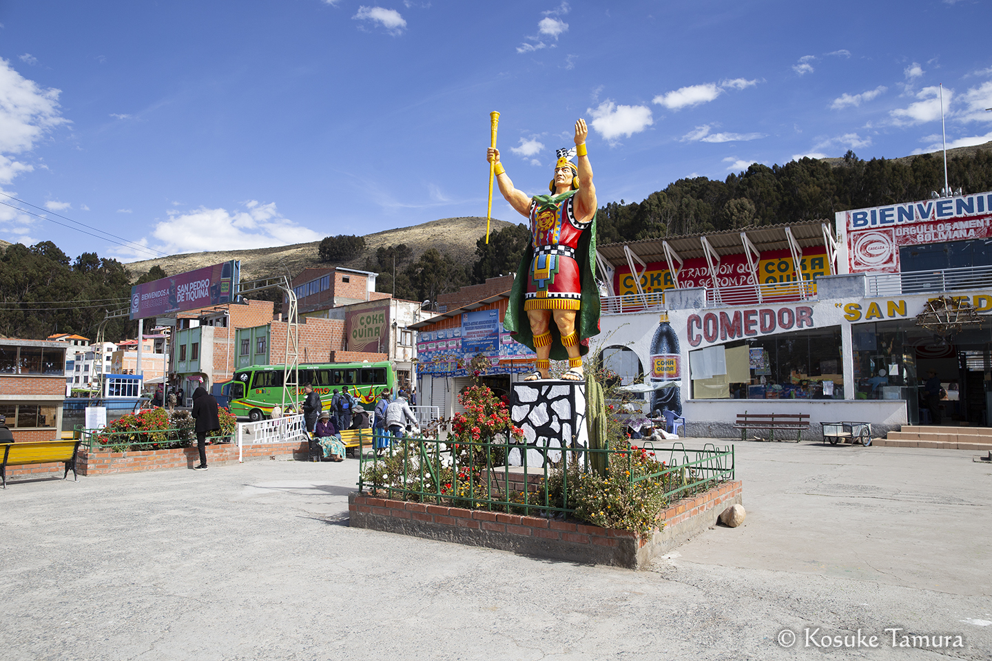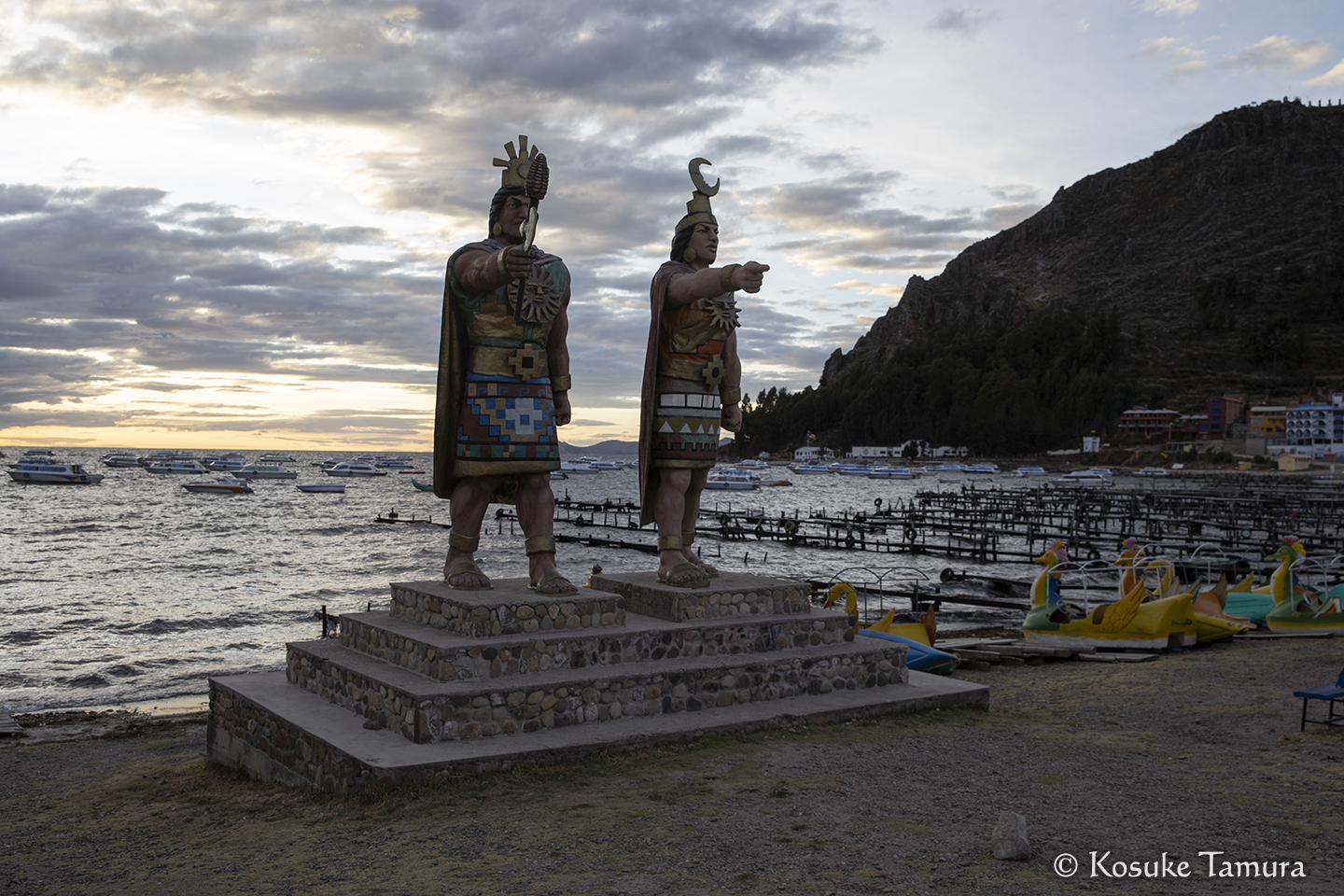 しばらくして、湖の対岸に渡るところでバスが停まった。3時間ほど待たされた後、バスは頼りない渡し船で運ばれ、乗客はモーターボートに乗り換えるが、これが大揺れして肝を冷やした。無事に対岸へたどり着くと、目の前にはマンコ・カパック像があって安堵する。まるでゲームで難所を超えた先に配置されるセーブポイントだ。